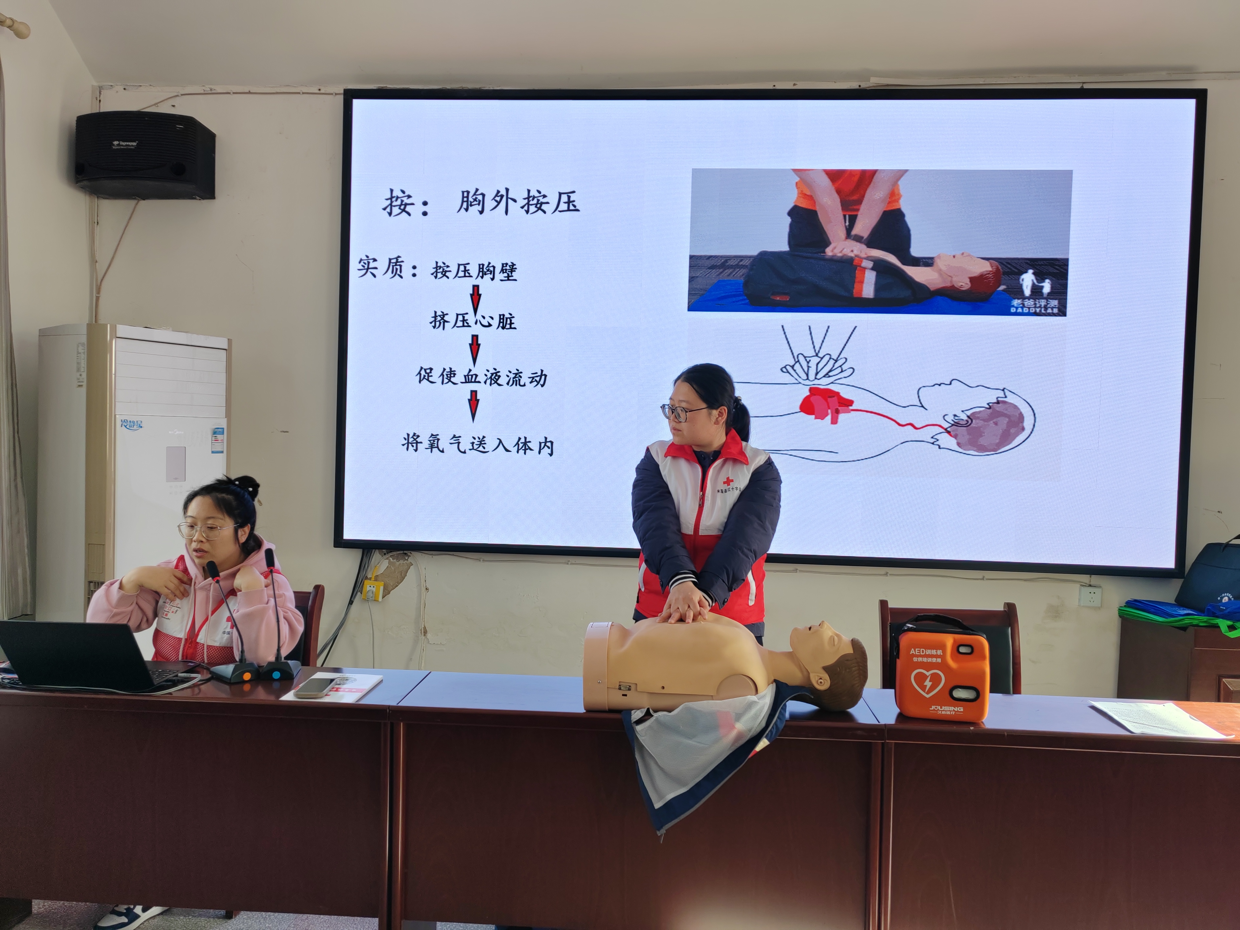 本次培训由县红十字会工作人员冯健老师主讲。她以通俗易懂的语言、规范操作,围绕心肺复苏、气道异物梗阻的现场处理、海姆立克急救法、自动体外除颤器(AED)等内容,采用“理论+实操”模式系统授课。生动的案例和细致演示让现场氛围热烈,学员们认真听讲、踊跃实操,熟练掌握急救关键步骤。