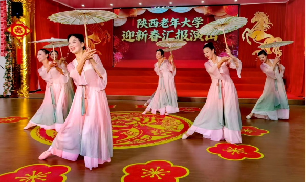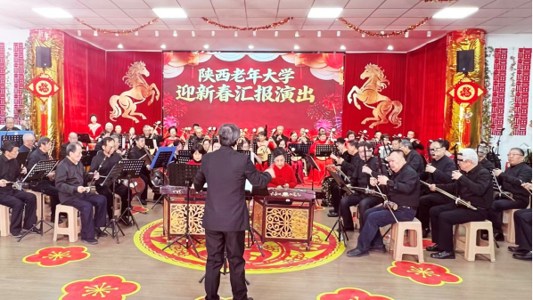 梅绽校园映银发,春来艺海醉晚霞。1月14日下午,陕西老年大学西苑厅二楼张灯结彩、喜气洋洋,2026年迎新春汇报演出在此隆重举行。陕西老年大学校长白向华,副校长李斌、祁翠娅与全校教职员工和老同志代表欢聚一堂,共迎新春。