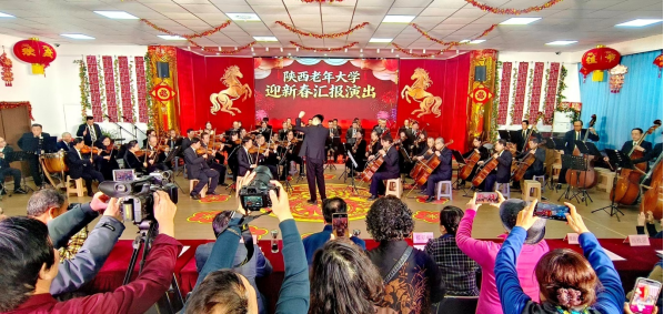 演出在欢快喜庆的民乐合奏《春节序曲》中拉开帷幕。校艺术团各表演团队的老同志倾情献演,13个精心编排的节目依次亮相。合唱《祖国颂》唱响赤子情怀,时装走秀演绎时尚老人银发风采,京剧选段曲调高亢,韵味十足,太极刚柔并济,舞蹈活力四射,交响乐团一曲《拉德斯基进行曲》用铿锵有力的节奏和优美流畅的旋律将演出推向高潮。现场掌声热烈,精彩之处引来观众阵阵喝彩。参演老同志纷纷表示,陕西老年大学为银龄群体搭建了很好的学习和交流展示平台,参加学习和活动已成为晚年生活中不可或缺的重要内容,今后还要不断通过在校学习提升艺术素养和表演质量,用更高水平的学习成果,展现新时代老年人有作为、有进步、有快乐的精神风貌。