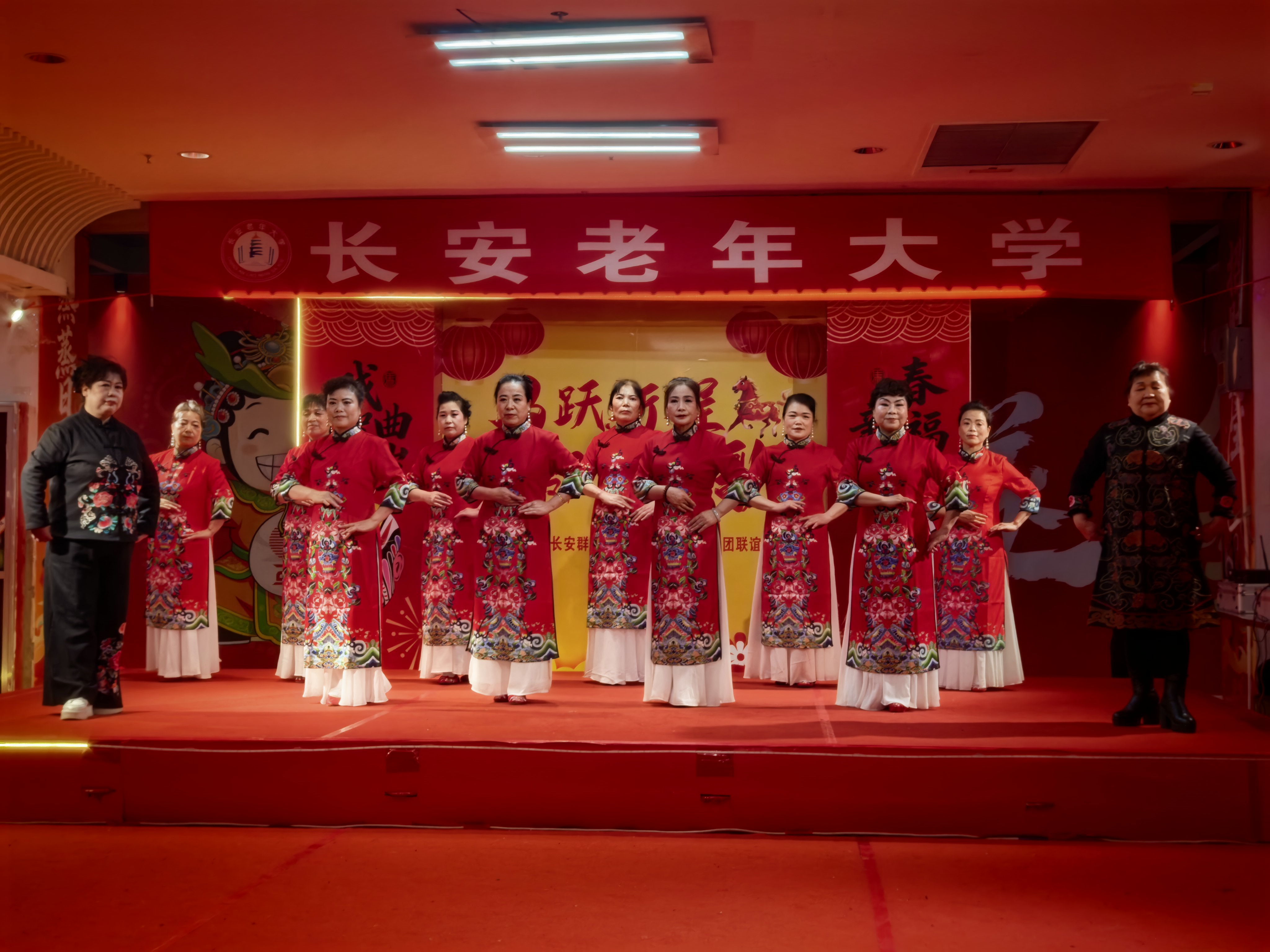2月10日下午,长百精致荟二楼,暖意融融、笑语盈盈,一场旨在“喜迎春节、祝福长安”的专场文艺演出在这里隆重举行。近百名老年学员满怀热情,以精心编排的文艺节目向长安人民送上最诚挚的新春祝福。本场演出学校各位领导亲临现场,给予鼓励指导。艺术总监张莉担任总导演。饶孔军、任婷华担任主持人。
