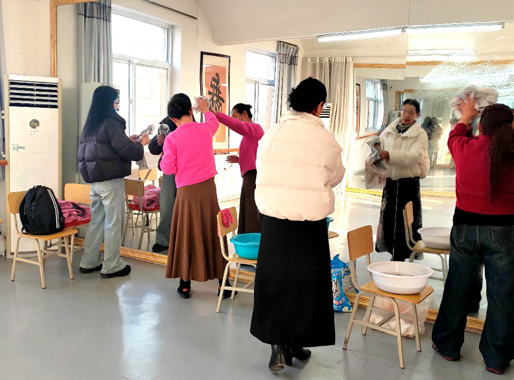报名间隙,校园里洋溢着浓厚的文化氛围。楼前空地上,数十名学员自发组织起秧歌表演,步伐轻盈舒展,引来阵阵喝彩。不远处,几名学员手拉手围成圈,跳起欢快的锅庄舞,一圈两圈越转越欢,引来阵阵喝彩。