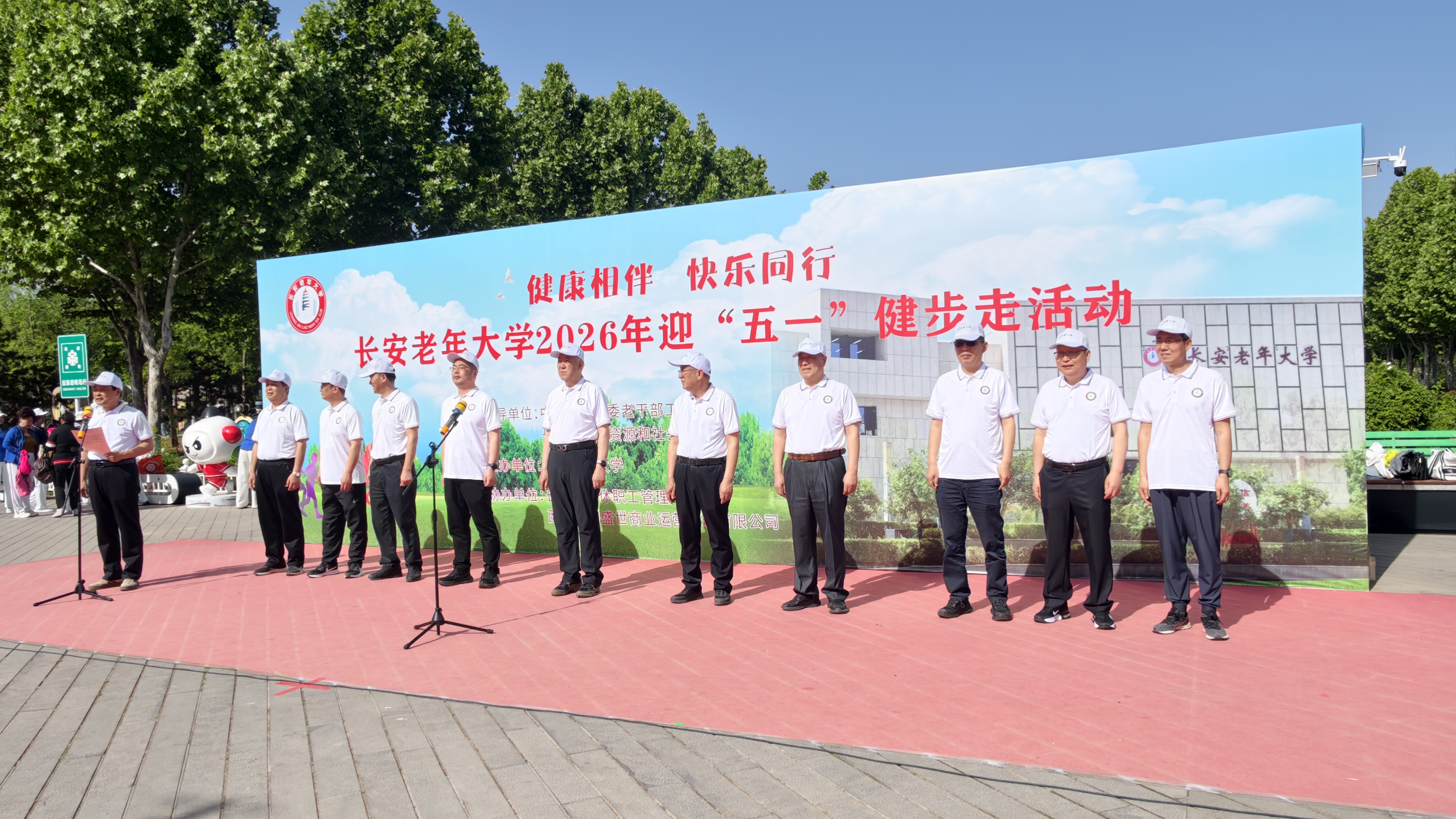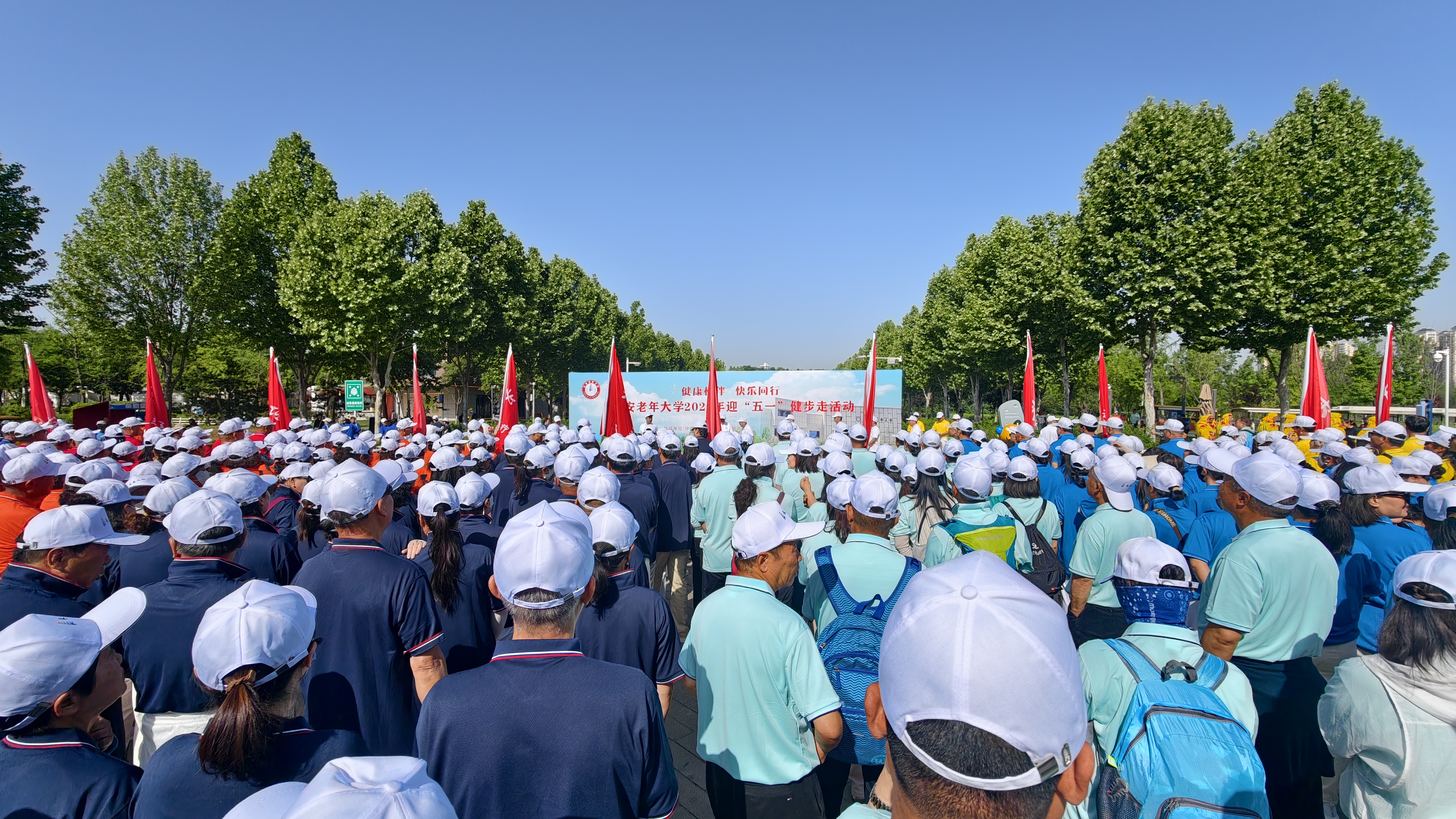 上午9时许,近千名师生在长安公园东门内广场集结完毕,组成十七个色彩各异的方阵。队旗迎风招展,各方阵统一着装、整齐划一,尽显神采奕奕之态。欢快热烈的锣鼓秧歌与舞蹈《最炫民族风》相继登台暖场,瞬间点燃现场氛围。在激昂奋进的气息中,健步走启动仪式正式拉开序幕。长安老年大学副校长杜文华主持仪式,副校长答贵龙代表学校发表热情洋溢的致辞。他指出,本次活动旨在响应全民健身号召,丰富学员精神文化生活,倡导快乐生活、健康养老的理念,展现学员积极向上的精神风貌。随后,校长李映昭宣布:迎“五一”“健康相伴 快乐同行”健步走活动开始!台上六把发令枪同时鸣响,在雄劲刚健的《运动员进行曲》声中,各方阵依次出发。