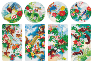 到了20世纪50年代,除了擦笔水彩年画,还产生了至今仍受广大人民群众喜爱的工笔重彩年画。作为年画它要求比一般的工笔重彩画色彩更鲜艳,要求具有年画的特点。用工笔重彩的技法画年画,色彩一定比一般的工笔国画要鲜艳,用纸除熟宣纸外,还可以用细纹水彩纸。颜料以国画色为主,此外还可以用部分水粉色和水彩色。用水彩色和水粉色画出来的效果要亮的多,鲜艳的多,印刷效果也好一些,同时修改起来也比较容易些,而且完成不需托裱。我本人创作的年画多属此类,如参加第七届全国美展的作品《鸟兽嬉耍图》和参加第四届全国年画展的作品《福富寿禧》及参加第六届全国年画展的作品《朝阳曲》均为工笔重彩四条屏年画,这两套条屏曾分别于1990年和1988年由陕西人民美术出版社出版发行。