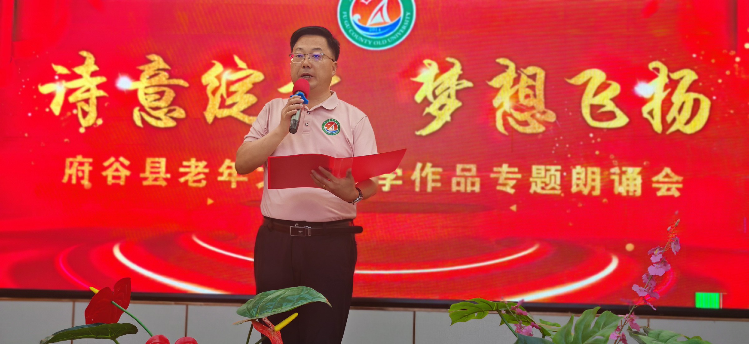 6月19日上午,府谷县老年大学校园内充满了诗意与激情,老师、学员和校工作人员欢聚一堂,一场以“诗意绽放 梦想飞扬”为主题的文学作品专题朗诵会在工作人员的《府谷老年大学发展赋》中拉开帷幕。