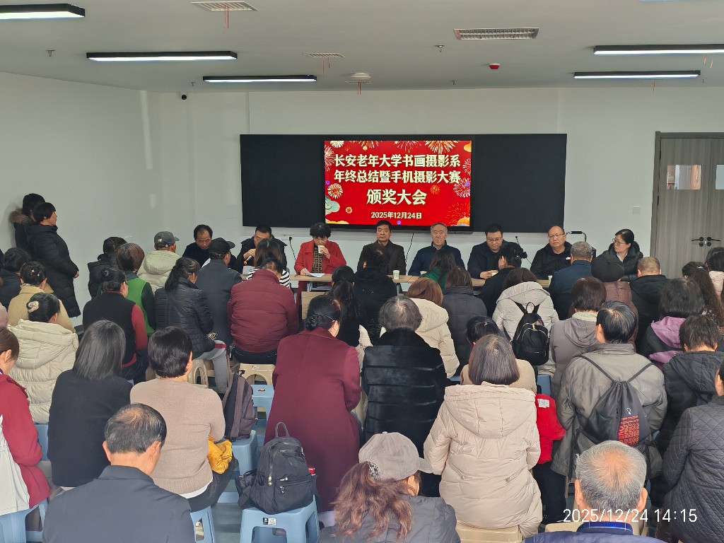 2025年12月24日,长安老年大学手机摄影大赛颁奖大会在主校区隆重举行。大会由书画摄影系副主任李伟主持,长安老年大学校长李映昭、副校长杜文华、办公室主任答贵龙、教务处主任周爱琴、书画摄影系主任王茂义,陕西长青助老基金会理事长赵飞、秘书长叶利红、基金会相关部门负责人,以及书画摄影系各班正副班长和部分学员代表共110余人参加会议。