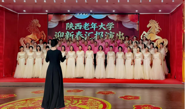 梅绽校园映银发,春来艺海醉晚霞。1月14日下午,陕西老年大学西苑厅二楼张灯结彩、喜气洋洋,2026年迎新春汇报演出在此隆重举行。陕西老年大学校长白向华,副校长李斌、祁翠娅与全校教职员工和老同志代表欢聚一堂,共迎新春。