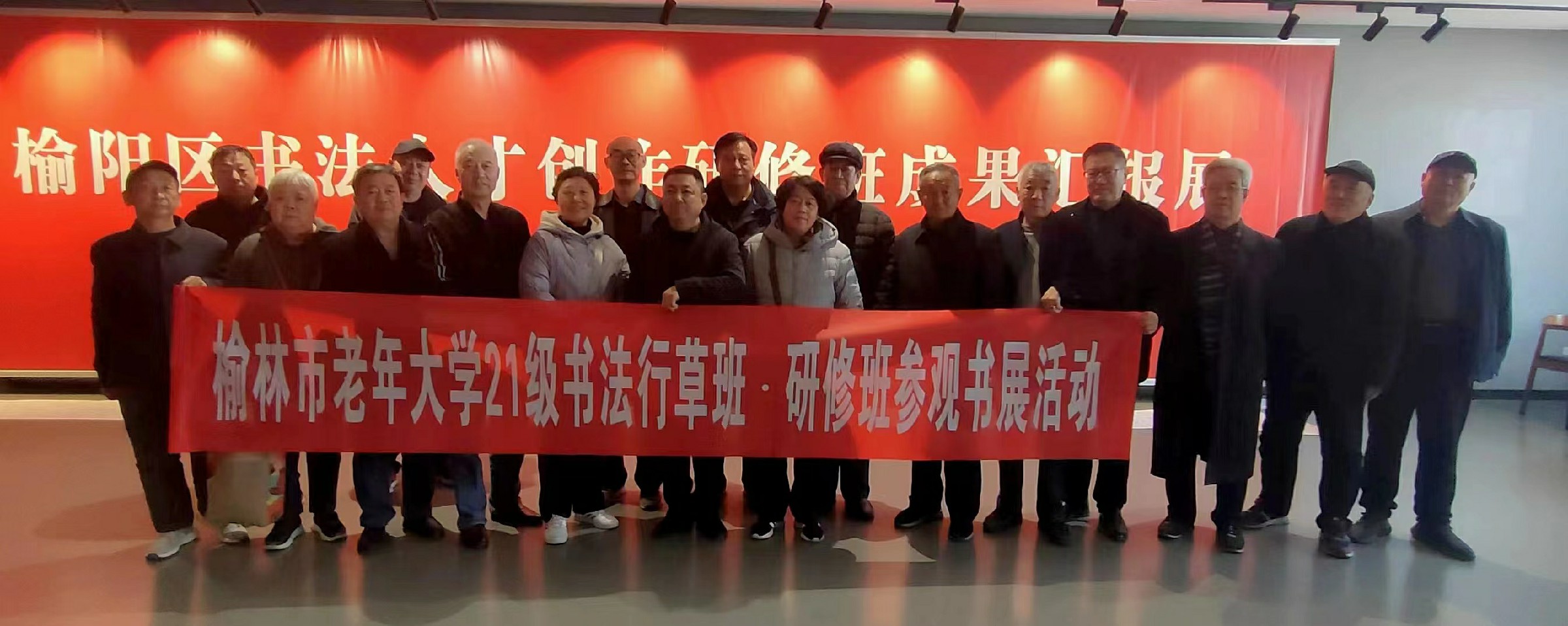 本次课是现场教学。学员们在市老年大学书法教师韦榆军的带领下,参观了由榆阳区书法协会举办的公益教学成果汇报展。这次书法作品展共展出各类书法作品300余幅,有方正规矩的正楷、有飘逸清秀的行书、有万马奔腾的草书、有刚劲有力的篆书,各种风格书法一应俱全。其中有很多榆林市老年大学各届学员的作品,有的作品多次在省市展出并获奖,还有参加国展书者的作品。